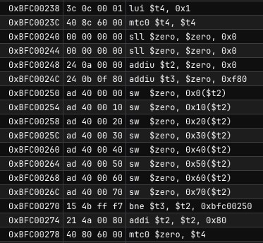 mtc0 $sr, $t4 sets the status register of the coprocessor 0 to he value contained in $t4. This means that the status register of COP0 is effectively 0x00010000. If you know a little about the status register, you would know that it’s important to check it when running the CPU. The COP0 status register bit 16 is set by the mtc0 instruction.