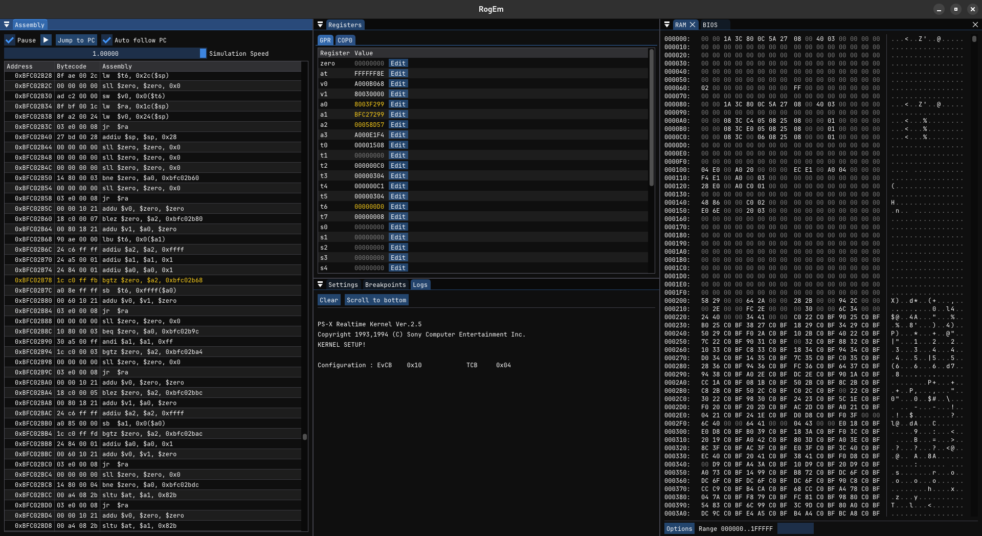The Current debugger UI of the RogEm emulator